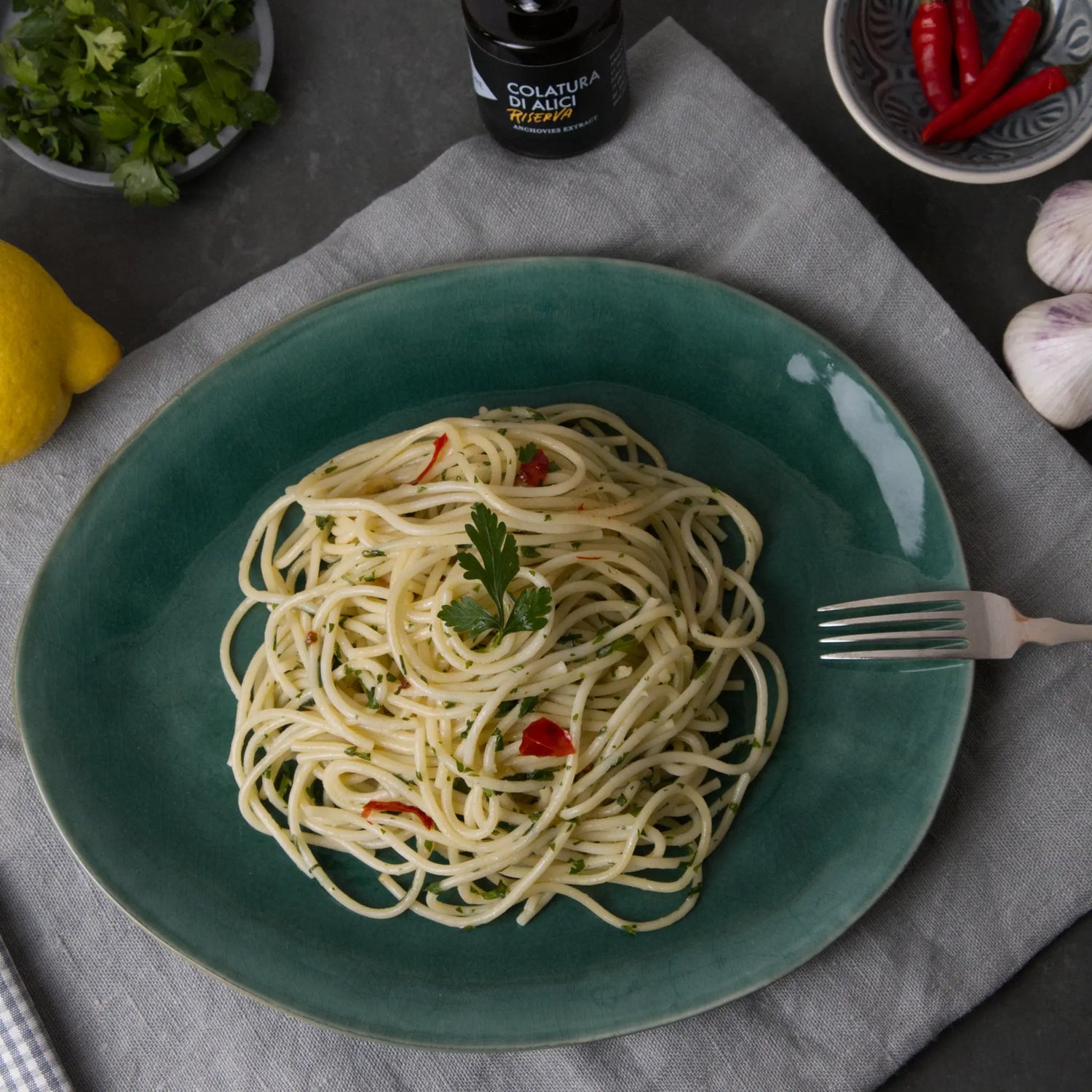 AMALFI - Spaghetti alla Colatura von höchster Qualität für 4-8 Portionen. Wir liefern den Spaghetti-Klassiker von FAELLA, Colatura di alici di Cetara von Armatore, das Olivenöl Essenza Peranzana von Frantoio Muraglia und geschmackvolle Peperoncini. Knoblauch & frische Petersilie musst du noch besorgen!