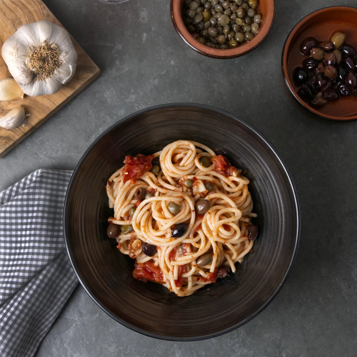Pasta-Box NAPOLI. Das ist Spaghetti alla Puttanesca von höchster Qualität für 4-8 Portionen. Wir liefern den Spaghetti-Klassiker von FAELLA, Taggiasca-Oliven von Calvi, Kapern von der Insel Pantelleria, Sardellen von Rizzoli und San Marzano-Tomaten DOP. Du brauchst nur noch frische Petersilie und etwas Knoblauch.