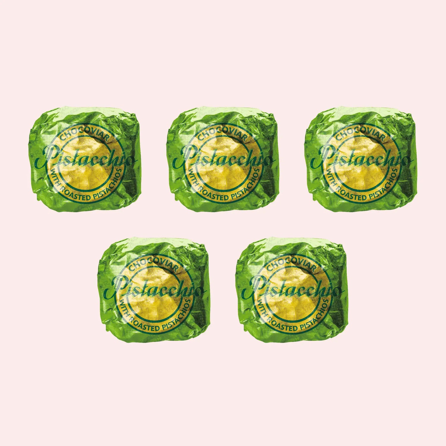 Eine große Praline, die mit Pistazien-Gianduia, gesalzenen Mandeln, Pistazien und Haselnüssen gefüllt ist. Ein Leckerbissen und groß genug zum Teilen!