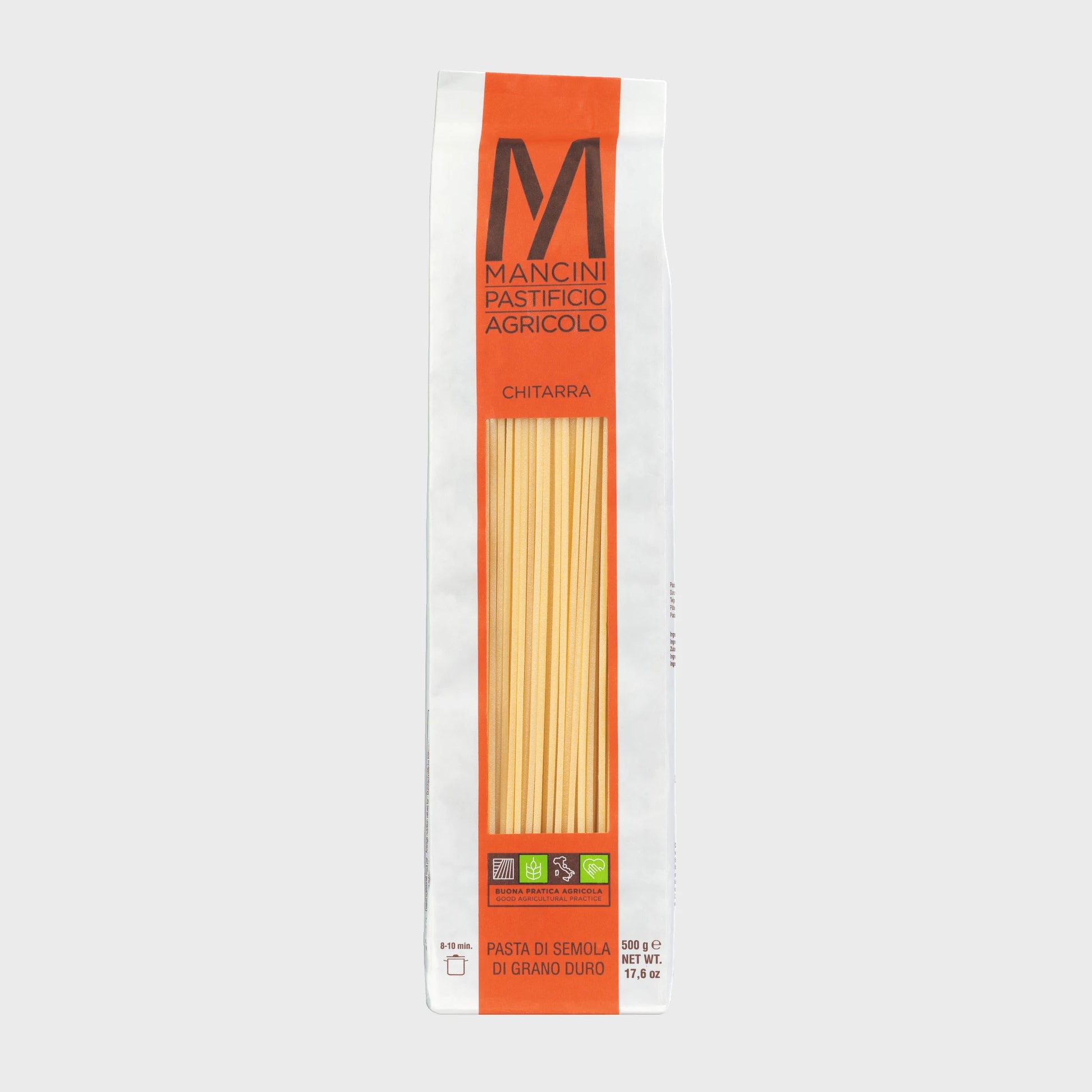 Mancini gilt als eine der besten Pasta-Manufakturen Italiens. Sie stellt ihre Pasta nur aus den Hartweizensorten her, die sie auf den eigenen Feldern in den Marken direkt vor den Türen der Produktion anbaut.